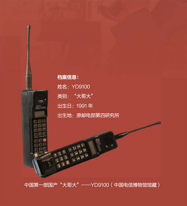 YD9100型蜂窩狀移動通信手持機,通體黑色,大約高20厘米,寬10厘米,外觀、體形都與常見的摩托羅拉產(chǎn)品相似,機身上印著 “YD9100”字樣,是我國自主研發(fā)的第一部模擬蜂窩移動通信手持機,1991 年由郵電部第四研究所研制開發(fā),1992年由江陰智能通信設(shè)備公司生產(chǎn)。