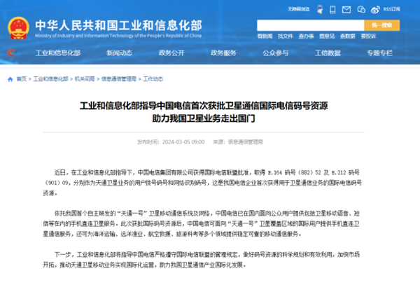 ◎我國(guó)電信企業(yè)首次獲得用于衛(wèi)星通信業(yè)務(wù)的國(guó)際電信碼號(hào)資源。3月5日,中國(guó)電信集團(tuán)有限公司已獲得國(guó)際電信聯(lián)盟批準(zhǔn),取得E.164碼號(hào)(882)52及E.212碼號(hào)(901)09,分別作為天通衛(wèi)星業(yè)務(wù)的用戶撥號(hào)碼號(hào)和網(wǎng)絡(luò)識(shí)別碼號(hào),這是我國(guó)電信企業(yè)首次獲得用于衛(wèi)星通信業(yè)務(wù)的國(guó)際電信碼號(hào)資源。