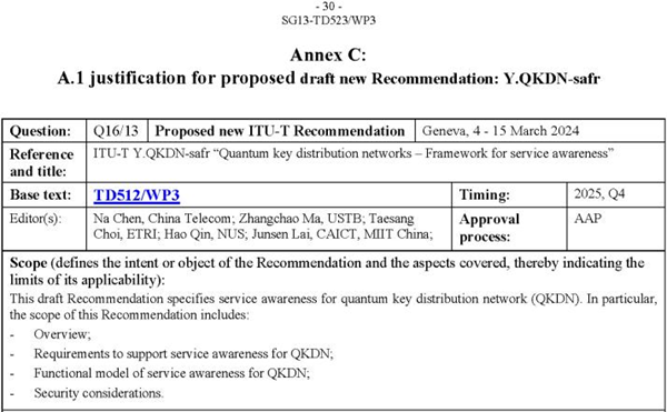 ◎我國(guó)量子通信國(guó)際標(biāo)準(zhǔn)立項(xiàng)取得新突破。3月4日至15日,國(guó)際電信聯(lián)盟電信標(biāo)準(zhǔn)部門第13研究組(ITU-T SG13)全體會(huì)議在日內(nèi)瓦召開。由中國(guó)電信研究院牽頭的國(guó)際標(biāo)準(zhǔn)立項(xiàng)提案ITU-T Y.QKDN-safr“Quantum key distribution networks–Framework for service awareness”(量子密鑰分發(fā)網(wǎng)絡(luò)——服務(wù)感知框架)獲批新立項(xiàng)。中國(guó)電信研究院與中國(guó)信通院等單位聯(lián)合牽頭的國(guó)際標(biāo)準(zhǔn)立項(xiàng)提案獲批新立項(xiàng)。這是繼中國(guó)電信代表央企首次推動(dòng)量子通信國(guó)際標(biāo)準(zhǔn)化后又一重大突破。