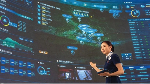 中國(guó)電信湖南公司依托5G、天翼云、人工智能等技術(shù)優(yōu)勢(shì),打造了“張家界智慧旅游平臺(tái)”。圖為2023年5月,中國(guó)電信湖南公司工作人員介紹“張家界智慧旅游平臺(tái)”。