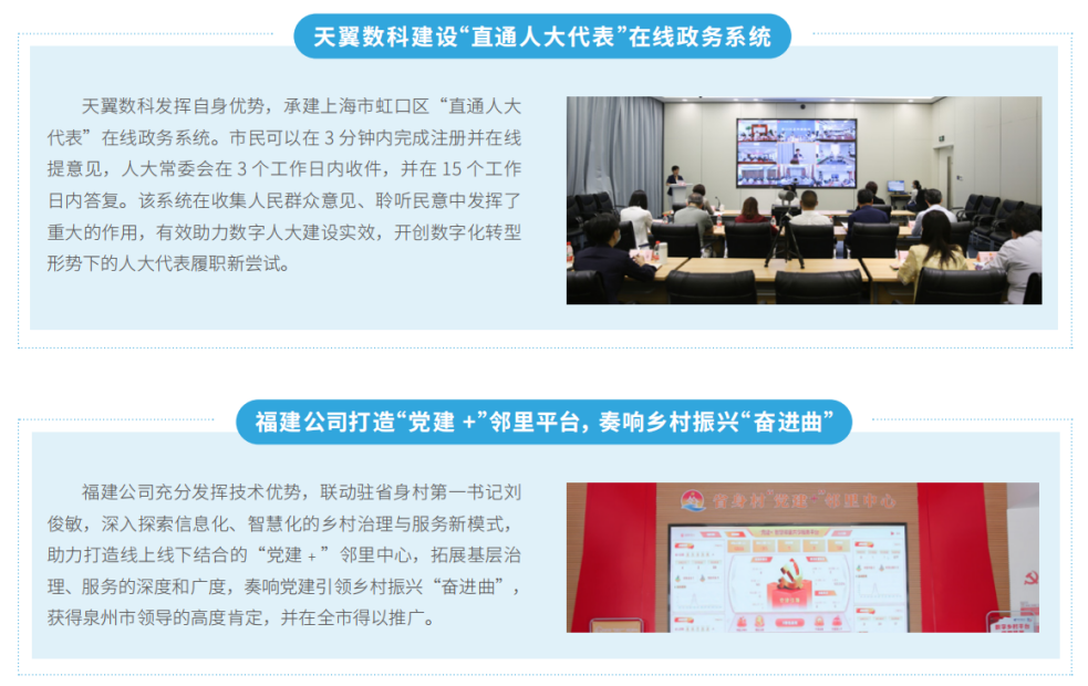 中國(guó)電信持續(xù)深化黨支部建設(shè)“百千萬(wàn)工程”,推進(jìn)黨的組織和工作向新主業(yè)延伸覆蓋,不斷夯實(shí)基層黨組織政治功能和組織功能。大力推廣“黨建+國(guó)家云建設(shè)”“黨建+科技創(chuàng)新”等好做法,積極組織黨組織和黨員在深化改革、科技創(chuàng)新、抗災(zāi)保通信等大戰(zhàn)大考中發(fā)揮“兩個(gè)作用”。圍繞產(chǎn)業(yè)鏈、供應(yīng)鏈、創(chuàng)新鏈深化“黨建翼聯(lián)”主題實(shí)踐活動(dòng),與政府、社區(qū)、企業(yè)等共建黨組織密切協(xié)作,助力社區(qū)治理、城市管理等,讓產(chǎn)數(shù)融合成果更好惠及人民群眾。成立首個(gè)黨外代表建言獻(xiàn)策工作室,組織統(tǒng)戰(zhàn)人員深入一線廣泛調(diào)研,有力發(fā)揮黨外代表人士作用。持續(xù)做好援藏援疆援青工作,深化對(duì)口支援,更好推進(jìn)產(chǎn)業(yè)興疆。