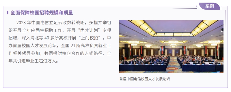 中國電信堅持人才是第一資源,發(fā)布人才強企工程實施方案,確立人才規(guī)劃目標,繪制人才圖譜,全方位培養(yǎng)、引進、用好人才。