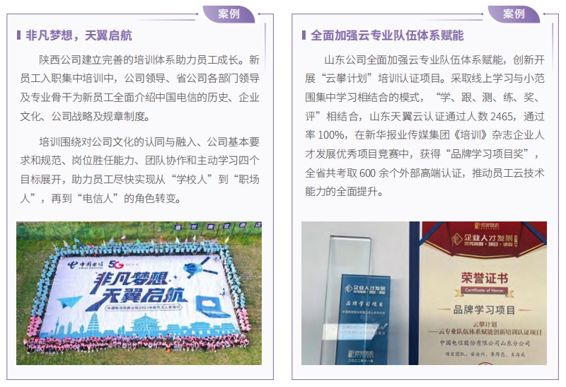 持續(xù)加強職業(yè)能力培訓(xùn)。全年開展 10 期“云改數(shù)轉(zhuǎn)大講堂”系列講座,2 期“轉(zhuǎn)型之道”系列講座,超過 136萬人次參加學(xué)習(xí)。分層分級規(guī)模開展技術(shù)人才培養(yǎng),通過“實戰(zhàn) + 認證”,規(guī)?;囵B(yǎng)產(chǎn)數(shù)、研發(fā)、云網(wǎng)三支工程師隊伍。面向一線員工隊伍,開展涵蓋各專業(yè)條線 41 個專業(yè)的技能認證考試,覆蓋 36.4 萬人次,推動技能人才向卓越工程師轉(zhuǎn)型。
