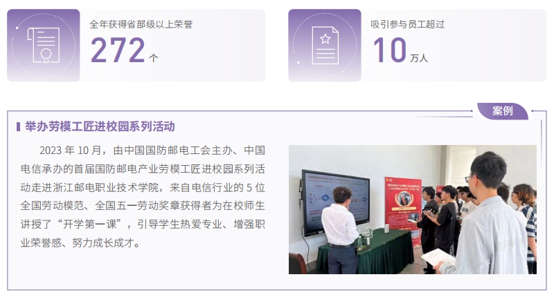 大力弘揚勞模精神、勞動精神、工匠精神,全年獲得省部級以上榮譽 272 個,優(yōu)化員工榮譽體系向科技創(chuàng)新、戰(zhàn)新業(yè)務(wù)、產(chǎn)數(shù)技能傾斜,組織百余場“勞模講堂”賦能基層一線,吸引參與員工超過 10 萬人。