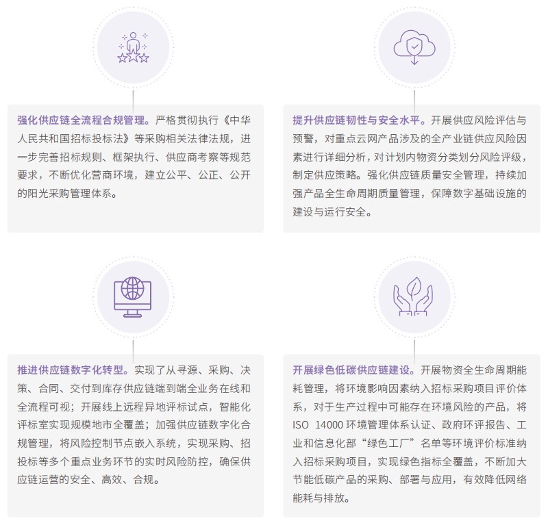 中國電信高度重視供應(yīng)鏈對社會和環(huán)境的影響,將 ESG 理念融入供應(yīng)鏈管理全過程,堅持建設(shè)韌性安全、價值創(chuàng)造、數(shù)智賦能、綠色生態(tài)、依法合規(guī)的供應(yīng)鏈管理體系,構(gòu)建開放共享的供應(yīng)鏈生態(tài),推動供應(yīng)鏈可持續(xù)發(fā)展。
