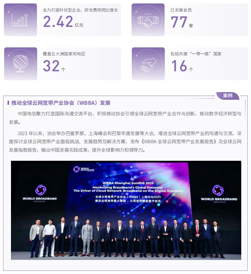 中國電信秉持開放合作、普惠共享理念,與利益相關(guān)方共享發(fā)展成果,以包容發(fā)展助力經(jīng)濟社會可持續(xù)發(fā)展。堅持以人為本,努力實現(xiàn)員工與企業(yè)共同成長,積極與合作伙伴共筑產(chǎn)業(yè)生態(tài),增強數(shù)字包容性,服務(wù)鄉(xiāng)村振興、支持公益慈善、推動全球網(wǎng)絡(luò)互聯(lián)互通,呼吁全球云網(wǎng)寬帶產(chǎn)業(yè)協(xié)會(WBBA)繼續(xù)圍繞聯(lián)合國和國際電聯(lián)縮小數(shù)字鴻溝的倡議,讓更多國家和地區(qū)的人民共享數(shù)字化發(fā)展成果。