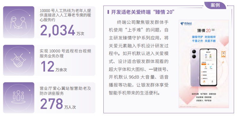 中國電信積極弘揚孝親敬老傳統(tǒng)美德,助力銀發(fā)一族跨越“數(shù)字鴻溝”。聚焦老年人日常生活涉及的高頻事項,集中力量為老年人提供更便捷、更貼心、更優(yōu)質(zhì)的信息通信服務(wù)和專屬服務(wù)。10000 號人工熱線為老年人提供約 2,034萬次直接進入人工尊老專席的暖心服務(wù),實現(xiàn) 10000 號遠程柜臺視頻服務(wù)業(yè)務(wù)辦理 12 萬余次。營業(yè)廳愛心翼站智慧助老及防詐講座服務(wù) 278 萬人次。升級中國電信 APP,實現(xiàn) AI 數(shù)字人的服務(wù)助老能力,持續(xù)完善關(guān)愛版用戶體驗,實現(xiàn)遠程助老、家庭圈功能。推動適老化數(shù)字技術(shù)迭代升級,AI 守護、翼家健康等老年人產(chǎn)品使用感知大幅提升。