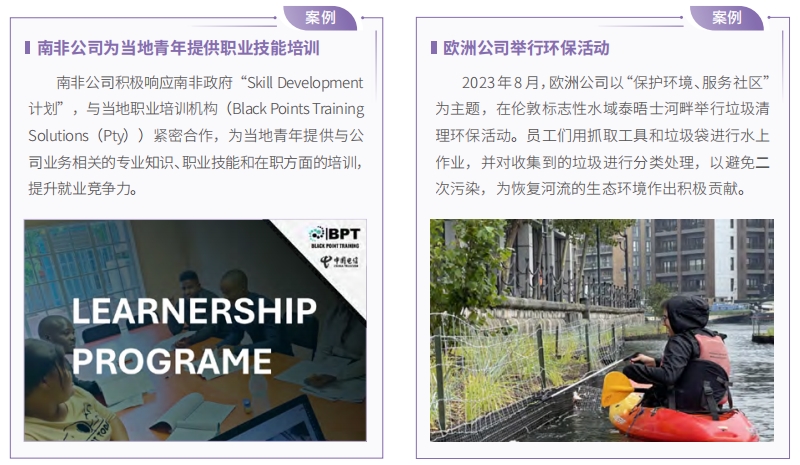 中國電信將聯(lián)合國可持續(xù)發(fā)展目標(SDGs)與國際業(yè)務(wù)發(fā)展有機結(jié)合,堅持合作共贏、共同發(fā)展,致力于加強信息通信領(lǐng)域的國際合作,積極參與高質(zhì)量共建“一帶一路”,推動全球化數(shù)字信息基礎(chǔ)設(shè)施建設(shè)。在海外發(fā)展中積極履責(zé),注重屬地化經(jīng)營,長期關(guān)注當?shù)厣鐓^(qū)發(fā)展,促進相互理解和文化融合。