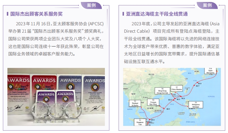 中國電信持續(xù)提升跨國通信服務(wù)能力,服務(wù)中國高水平對外開放。國際化經(jīng)營覆蓋全球主要市場,在全球42 個國家和地區(qū)設(shè)立 50 家分支機構(gòu),與 400 多家境外電信運營商開展了跨境數(shù)據(jù)和語音合作,為跨國企業(yè)客戶提供個性化、高性價比的綜合通信解決方案,積極助力中資企業(yè)走出去,外資企業(yè)進入中國市場。