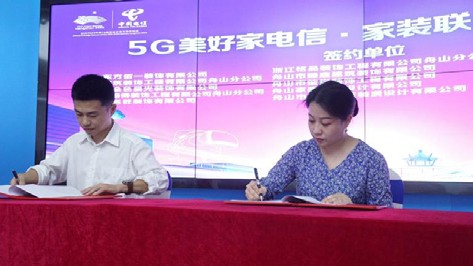 2020 年 9 月 6 日,舟山公司舉辦“5G 美好家電信·家裝聯(lián)盟成立暨卓越服務”發(fā)布會。圖為舟山公司與各家裝公司代表簽約現(xiàn)場