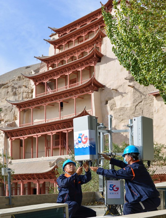 2020 年 8 月 6 日,甘肅省酒泉分公司員工在莫高窟做 5G 網(wǎng)絡(luò)預(yù)檢預(yù)修