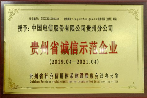 中國(guó)電信股份有限公司貴州分公司被評(píng)為貴州省誠(chéng)信示范企業(yè)