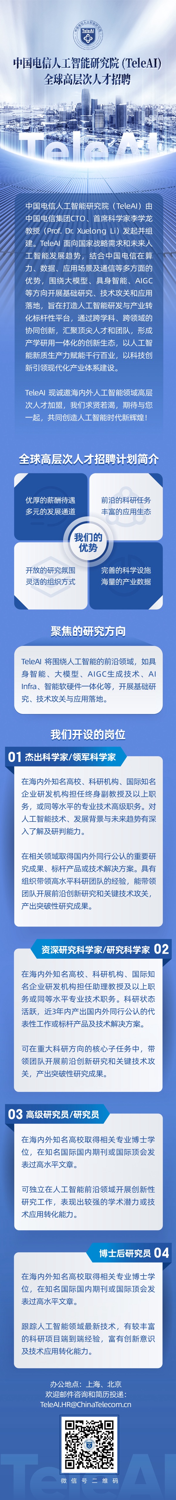 中國電信人工智能研究院(TeleAI)全球高層次人才招聘